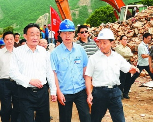 5月28日,中共中央政治局常委、全国人大常委会委员长吴邦国来到受灾严重的绵竹市汉旺镇、平武县平通镇等地察看灾情,看望企业职工和学校师生,慰问灾区干部群众和来自四面八方的救援人员。这是吴邦国在东方汽轮机厂汉旺基地受灾厂区察看灾情,指导抗震救灾工作。