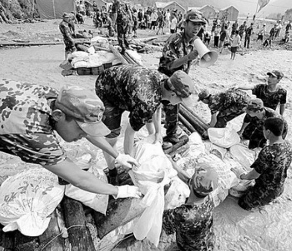 5月28日,四川绵阳平武县执行抗震救灾任务的解放军某部官兵为驻地受灾群众架桥修路,方便受灾群众。