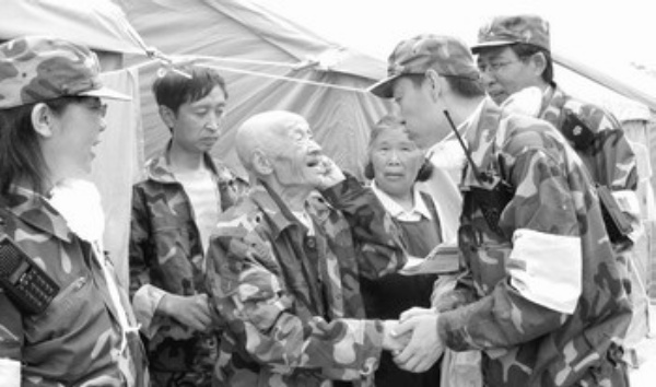 5月28日,在汶川县映秀镇,北京军区二六一医院抗震救灾医疗队的医护人员在进行巡诊。 张 奎摄(新华社发)