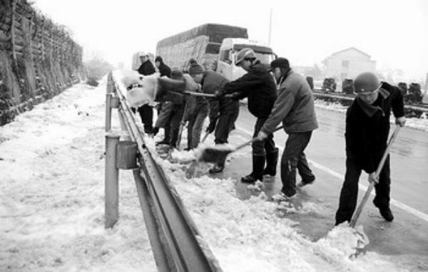 2月1日,湖南省衡阳市湘江乡茅叶村村民在衡枣高速路上铲雪清路。 当日,湖南省衡阳市又降大雪,当地立即组织近万人上街、上高速路铲冰扫雪,保障市民日常生活和城市道路交通。 章 尧摄 (新华社发)
