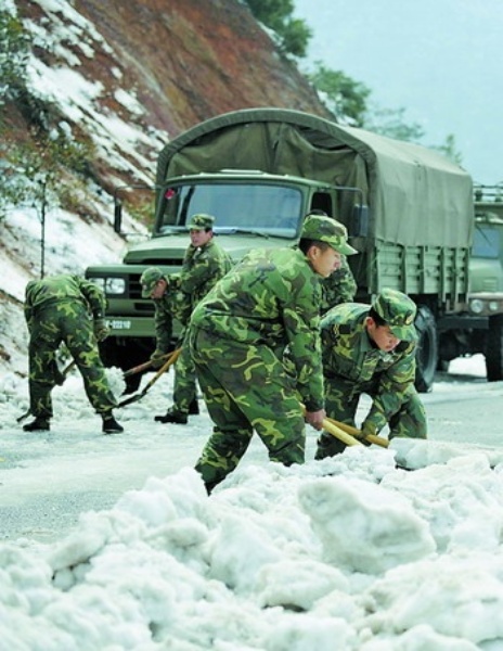 2月3日,在省道202线广西资源段,塔山英雄团的战士们在奋力铲雪。当日,解放军某部官兵开进广西资源县,在资源县城通往外界的“生命线”省道202线上开展除冰作业,确保生命线畅通。 新华社记者 周 华摄