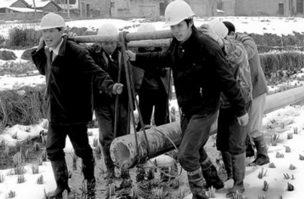 2月3日,湖南洞口县电力公司高沙供电所职工在高沙镇大路村冒着严寒,踏着积雪抢修电网。春节临近,该县组织抗灾抢险突击队抢修恢复电网线路、通讯设施,确保全县城乡居民春节期间都能正常用电。滕治中摄(中经网供图)
