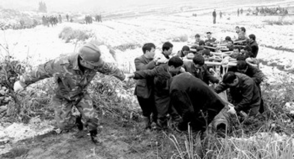 2月4日,江西东乡县小璜镇珊壁村的“冰雪山”上,民兵突击队正在运送电杆以抢修被损坏的输电线路。东乡县遭遇了近50年来持续时间最长的强冰冻灾害袭击,造成大批电力设施和电网被损,并于1月28日全县断电。为尽快抢修损毁的设施和线路,确保全县人民在春节前能正常供电,该县武装部成建制组织510名民兵冒严寒、踏冰雪、上高山,帮助抢修人员运输抢修电网设备物资。