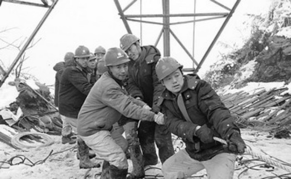 2月6日,陕西电力抗冰抢险队施工队员在对江西萍乡安源区47号杆电塔进行抢修,江西电网已基本恢复联网运行。 周 科摄(新华社发)