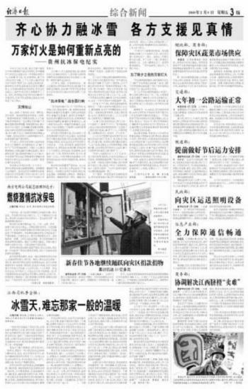 另外,因此次大面积冰灾停电的贵州500多个乡镇的居民,通过当地武警官兵和驻渝某集团军等帮助紧急抢运,供电部门连夜组织工人安装,也都过上了一个明亮的春节。