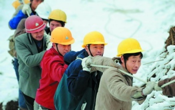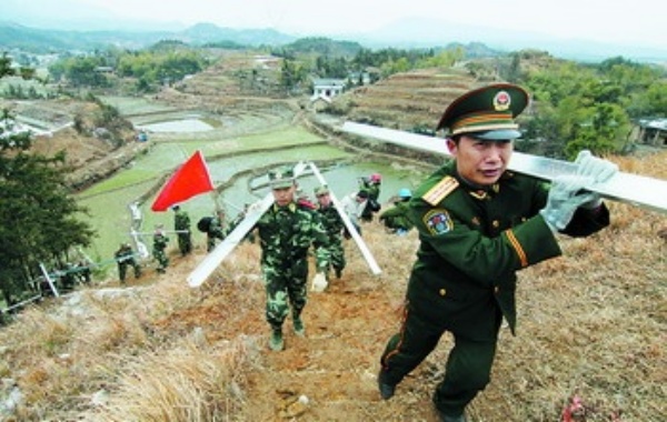 警民合力抢修忙 2月9日,武警官兵将铁塔的部件运送到湖南省宁乡县青山桥乡山上的抢修现场。春节期间,武警湖南省娄底市支队官兵和甘肃送变电工程公司几百名职工放弃休假,运送抢险铁塔部件,抢修倒塌的电力铁塔,全力投入“抗冰保电”之中。 郭国权摄(新华社发) |