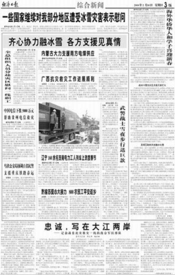 面对罕见的冰雪灾害,驻守在长江两岸的南京军区部队坚决执行胡锦涛主席和中央军委的命令,全力投入到抗灾救灾行动中———