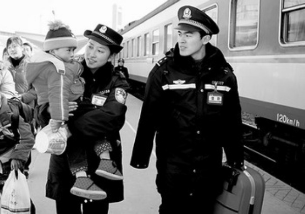 2月13日,铁路民警在安徽淮北火车站帮助乘客。为应对春运返程客流高峰,淮北铁路派出所加大警力投入,增强安全保卫,维持秩序,确保旅客安全。 新华社发