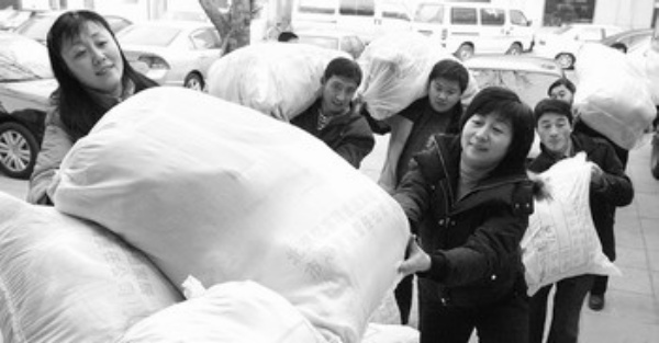 雨雪冰冻灾情在我国南方部分地区发生后,社会各界干部群众纷纷踊跃捐款、捐物,心系灾区。这是北京市丰台区捐赠中心,工作人员正在搬运捐赠物品。 本报记者 李景录摄