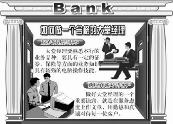 由于直接面对数量庞大的客户群体,大堂经理不仅要全面掌握自己银行的业务,还要了解其他银行的产品和业务。因为客户经常用对比的心态来咨询,了解得越多就能给他们越客观的回答,这样便于客户同时了解几家银行的产品状况,做出合适的选择。