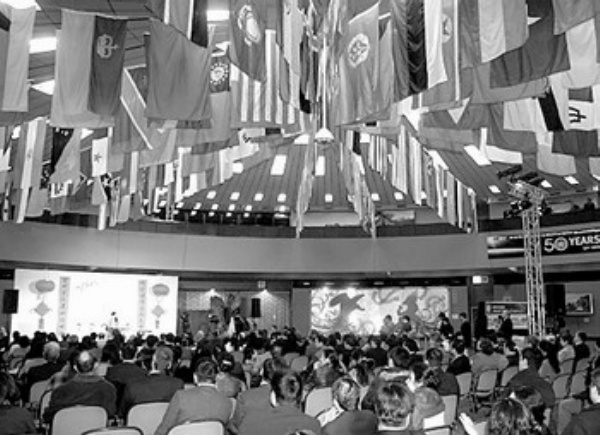 1月30日,中国驻维也纳联合国代表团与维也纳联合国办事处联合举办的“2008年中国春节晚会”在维也纳联合国总部万国旗大厅取得了圆满成功。晚会精心编排了15个融合了中西方艺术特点的精彩文艺节目,将古典与现代相结合,同时展现了中国各民族不同的文化传统,获得了观众的广泛好评。这是中国春节晚会首次走进维也纳联合国大楼。图为400多名联合国官员观看精彩的演出。
