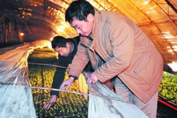 2月13日,宁夏银川市西夏区农业技术推广中心技术员丁增伟(右)在大棚里查看菜苗。受冰冻灾害影响,银川市有6.5万亩温棚瓜菜受灾,蔬菜市场供应量减少。为此,当地政府组织农技人员深入一线指导受灾菜农恢复生产,以确保“菜篮子”供应。