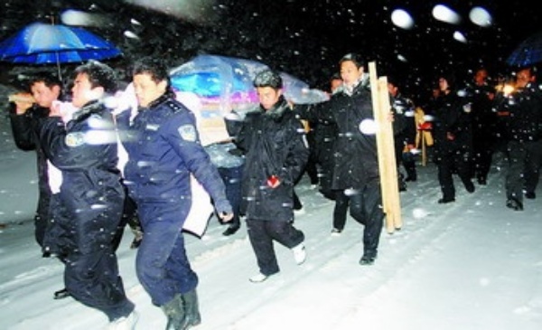 由于路况太差,路上大家都放弃小车,一起推着运载病人的车前行。最后,因冰雪淤积太深,农用车实在无法前行,大家便肩扛手抬担架徒步前行。18时40分,病人情况越发紧急,陈辉决定请求公安局支援。