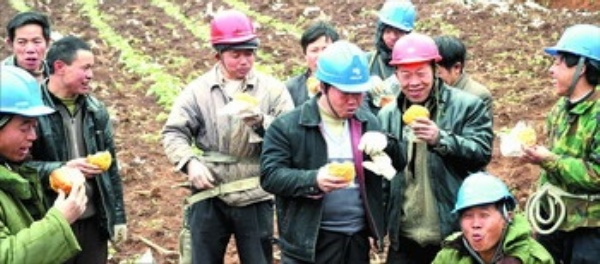 2月13日,贵阳市牛场乡高邦村,市供电局清镇分局的突击抢修人员在施工现场抓紧时间吃干粮,准备再战。由于山林道路积冰过厚一时难以消融,电路维修十分困难,突击抢修人员已经踏冰卧雪抢修恢复电杆200多基,待抢修的500多基乡村电杆预计在本月底完成。 彭 年摄