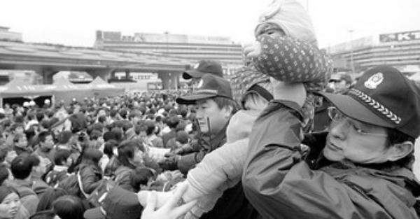 “快救人呀,有人晕倒了!”2月1日下午2时59分,广州火车站临时候车棚内有人高声呼喊。铁路民警嗖地跳上栏杆,只见距离他们10米远处,一名年轻的孕妇倒在一个人身上,面色苍白,情况万分危急———“旅客们,每人伸出双手,快把她举起来!”见此情景,冲进人群显然不可能,公安民警急中生智,立刻招呼旅客帮助把晕倒女子举起来往外“传送”。由于候车棚内旅客密密麻麻,把晕倒孕妇举起来的难度可想而知。民警急得把嗓子都喊哑了。