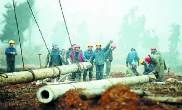 2月18日,长沙电力公司工程人员在郴州支援蓉肖2号线110千伏输电线路重建工作。春节过后,遭受五十年一遇冰雪灾害的湖南郴州灾后重建工作陆续展开。目前郴州城区水电供应等基本恢复正常。 新华社记者 赵众志摄