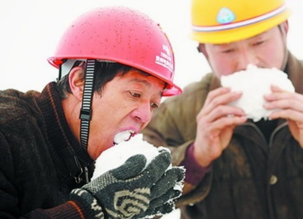 2月17日,在贵州省开阳县山区巡线的两位电力工人吃雪消渴。 新华社记者 杨俊江摄