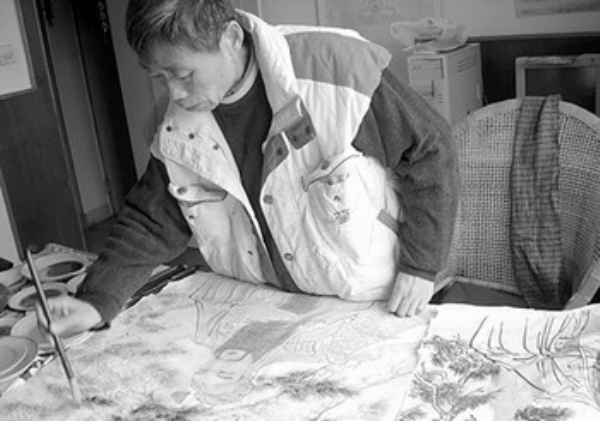 屋里屋外,张宇总是戴着帽子,起初我以为是因为天冷,后来才知道是因为十几年前他在创作《元春省亲》屏风时,没日没夜地加班,一天不小心从厂里的楼梯上栽下来,摔成了脑震荡,并导致了脑内出血,现在稍一受凉就会头痛。