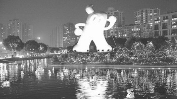上图 2月21日,上海世博会吉祥物“海宝”造型在即将开建的展示中心外亮相。 新华社记者 裴 鑫摄
