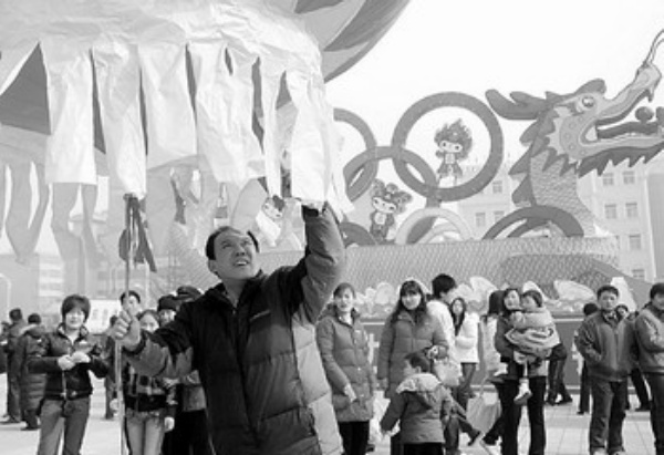 2月21日,河北涿州文化广场,工作人员正在悬挂彩灯。当天,为期6天的涿州第八届花灯节开幕。以鼠年、奥运为主题的各类花灯纷纷亮相,引来各地游客观赏。 本报记者 赵 晶摄