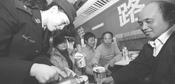 2月22日,乘警宋菡(左)在给乘坐农民工专列的旅客倒开水。 当日,合九铁路开行2008年春运以来的首次农民工专列,运送1500多名农民工从安徽安庆前往北京。 新华社记者 陈晔华摄