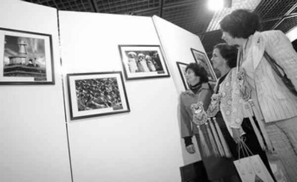2月19日,在墨西哥城举办的“中国·甘肃民族风情摄影展”上,三名墨西哥妇女戴着中国传统挂饰观看反映甘肃省宗教文化的图片。当日,“中国·甘肃民族风情摄影展”在墨西哥城开幕,展出的80多幅图片展示了中国甘肃省甘南藏区的地理地貌、宗教文化及藏区日新月异的景象。