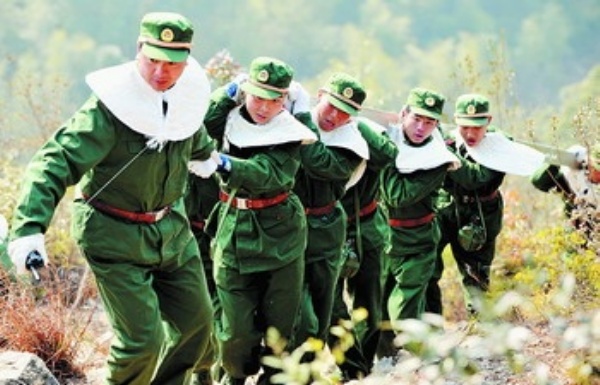 2月16日,武警江西总队南昌市支队官兵正在江西万安县境内的万潭线运送204号铁塔构件。 新华社记者 宋振平摄