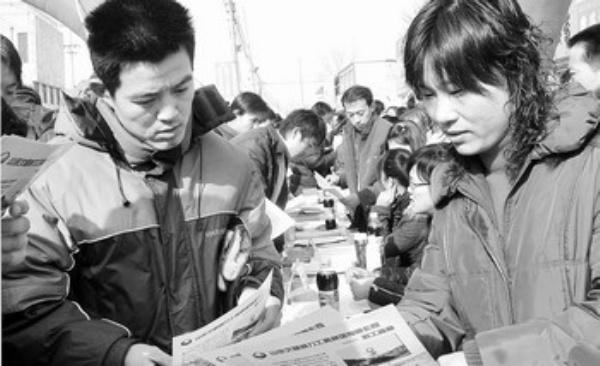 2月15日,山东枣庄市山亭区,农村青年在了解招工信息。当日,山亭区劳动和社会保障局在农村集市上免费举办帮助农民工进城求职就业的“春风行动”招聘洽谈会,为进城务工的农民工解决求职难题,传授维权知识,有40多家企业到现场招聘,提供适合农民工就业的各类岗位达2500个。 李宗宪摄