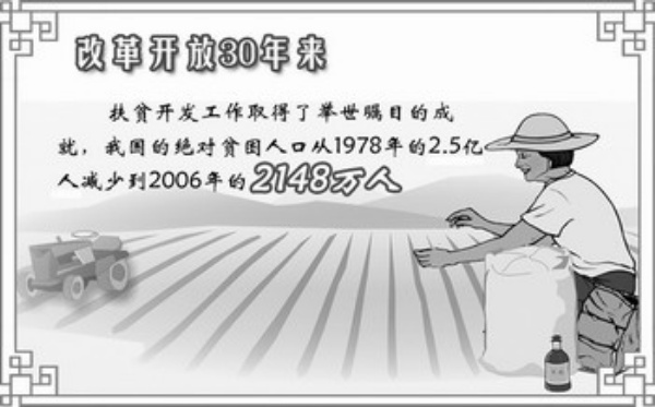 范小建:刚才河北广宗县、黑龙江桦川县简要介绍了各自扶贫开发工作的情况和取得的一些成果。从全国来讲,应该说改革开放30年来,扶贫开发工作取得了举世瞩目的成就,我们国家的绝对贫困人口从1978年的2.5亿人减少到2006年的2148万人,绝对贫困人口的贫困发生率从30.7%下降到2.3%,应该说成就是非常显著的。