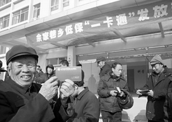 山东省无棣县佘家巷乡石庙村村民张宝岐领到了县民政部门发放的农村低保户一卡通存折。山东省今年提高农村最低生活保障标准,通过一卡通直接发放到户。 蒋惠庆摄(中经网供图)