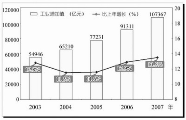 2007年,我国全部工业增加值107367亿元,比上年增长13.5%。规模以上工业增加值增长18.5%。