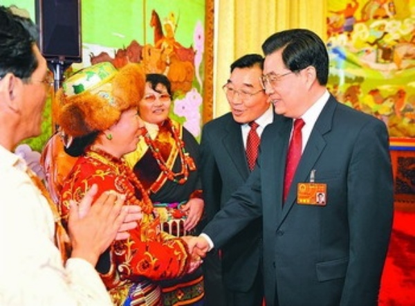 在西藏厅门口,身着民族服装的藏族代表普布、门巴族代表白丹措姆、珞巴族代表晓红,向总书记献上洁白的哈达。胡锦涛高兴地同代表们互祝“扎西德勒”。