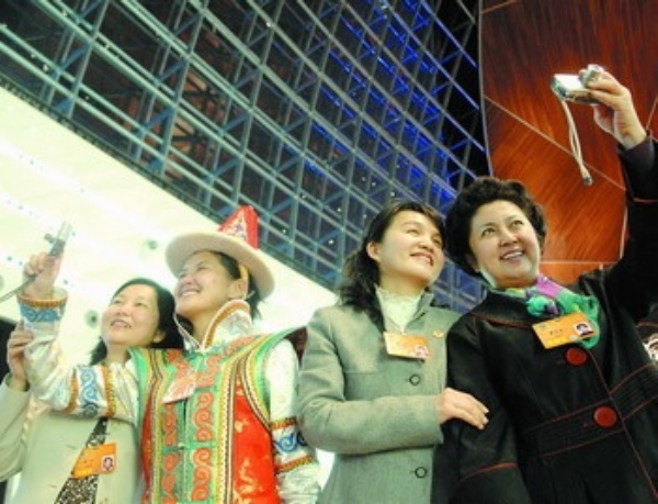 3月7日晚,出席全国政协十一届一次会议的部分委员来到国家大剧院参观,委员们纷纷拿出相机拍照留念。 本报记者 赵 晶摄
