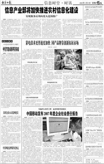 本报讯 2008年,信息产业部将结合当前新形势下建设新农村的新要求,在继续完善农村通信基础设施建设的同时,加大农村信息服务的推广应用力度,推动工程由“以建为主”到“建用并举”的转变,实现工程由量变到质变的跃升,促进农村通信发展和农村信息化建设迈上一个新台阶。