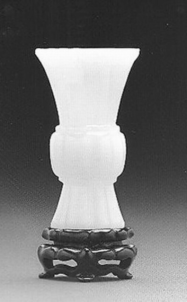 花觚来自于青铜器的“尊”,出身于礼器,故自始就不以实用为主,而主要用于陈设。瓷制花觚始于元代,流行于明清。因造型端庄大方,故主要用于布置厅堂,民间也有用来插花的。这件白玉花觚,高只有8.3CM,显然是用来把玩的。因玉质纯净,以材质取胜,没有过多雕琢。小花觚双面素身,一面略带皮色,高圈足,菱花形,挖堂精巧,打磨规整。此器物虽小,但制作精致,用来陈设在案头的多宝格或手中把玩,温润可爱,不可多得。并配有红木菱花形底座,足见匠心。以17.05万元成交。