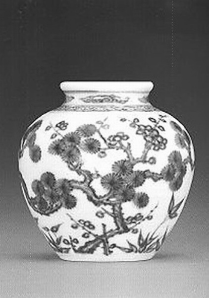 罐本是一生活常用器,但此罐只有7.8CM高,显然与实用无关。此罐瓮状广口,造型敦厚。外口部绘四组流云纹装饰,肩部绘卷草纹,腹部通景绘松、竹、梅岁寒三友图,画意清高,笔触圆润,青花发色鲜艳青翠,图案饱满。大小盈手一握,特别适合把玩。底有“大清雍正年制”双行揩书立款。以35.2万元成交。
