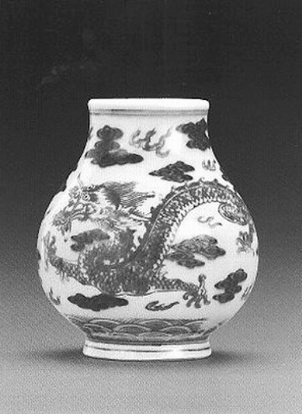 “尊”为古代礼器,故造型端庄大气。此尊高只有10CM,小器大样,把手可玩,十分可爱。底有“宣德年制”二行楷书款,实为乾隆年间仿制。此尊外壁以青花绘云纹,釉里红绘五爪龙纹和火焰,增加了龙的气势和威武。青花发色亮丽,釉里红色彩鲜艳,红蓝二色相互映衬,别具一格。从其龙图及制作之精致来看,并非一般人的玩物,应属皇家所有,故十分珍贵。以11万元成交。