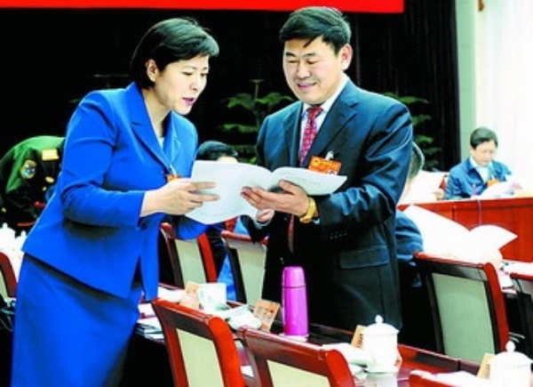 3月10日下午,人大甘肃代表团会议室。郭玉芬代表(左)和周绪红代表正在看两高报告。周绪红是新当选的全国人大代表,郭玉芬详细向他介绍前几年两高报告的情况。两位代表认为,两高在公正司法、执法为民等方面做了大量工作,为维护社会公平正义、推进依法治国、建设社会主义法治国家作出了积极贡献。 本报记者 李景录摄