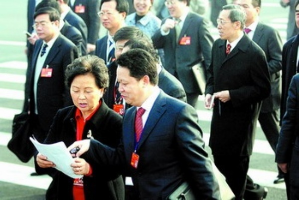 3月10日上午,十一届全国人大一次会议举行第三次全体会议,听取两高报告。入场时,人大四川代表团的童若春代表(左)和杨兴平代表拿着相关资料,边走边议。 本报记者 赵 晶摄