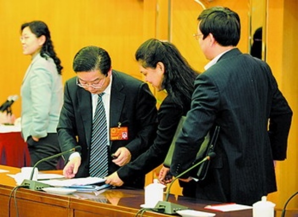3月9日下午,人大安徽团会议室。当天的审议结束后,耿学梅代表(右二)和同团的刘健代表(左二)就准备向大会提交的议案再做推敲。 本报记者 李景录摄