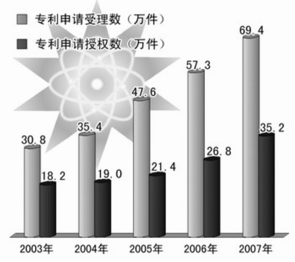科技成果的大量产生,在于科技队伍的不断壮大和人员素质的不断提高。现在,许多企业都建立了自己的科研队伍,教育科研机构加强了与企业的产学研结合。而科研队伍的壮大,又进一步促成了科技成果的产生。仅2002年—2006年,全国累计登记省部级以上重大科技成果就有15.5万项。在一些技术领域,我国企业掌握的核心技术逐渐增多,据统计,从2003年到2007年,我国专利申请量和授权量分别以22.5%和17.9%的年平均增长速度递增。2006年我国专利部门受理的国内专利申请量有47万件,2007年达到58.7万件。