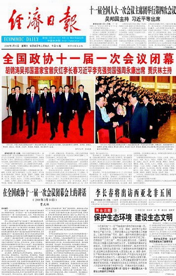 贾庆林指出,会议期间,委员们通过大会发言、提交提案、反映社情民意信息、参加小组讨论等形式,重点就转变经济发展方式和完善社会主义市场经济体制、发展社会主义民主政治、推动社会主义文化大发展大繁荣、办好北京奥运会和残奥会、保障和改善民生等问题咨政建言,提出了很多有价值的意见和建议,充分体现了人民政协这一政治组织和民主形式的独特优势,展示了广大政协委员致力发展、关注民生的时代风采。