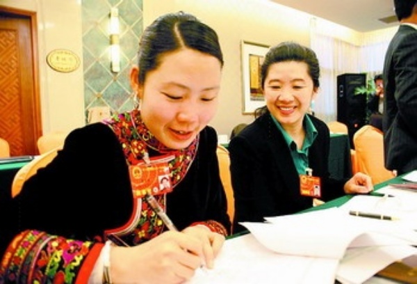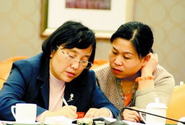 | 雷金梅代表(左)来自福建福安市坂中乡后门坪村,她与同团的曾静萍代表共同修改、完善向大会提交的建议。 |