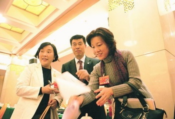 | 陈晓萍代表(右一)曾经是下岗工人,她和几位下岗的姐妹们创办了福州家喻户晓的早点品牌。这是她与其他代表一道,在准备提交大会的议案上签字。 |