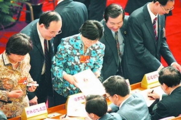 3月17日下午,十一届全国人大一次会议在人民大会堂举行第七次全体会议。会议开始前,许多代表在大会纪念册上互留赠言。 本报记者 李景录摄