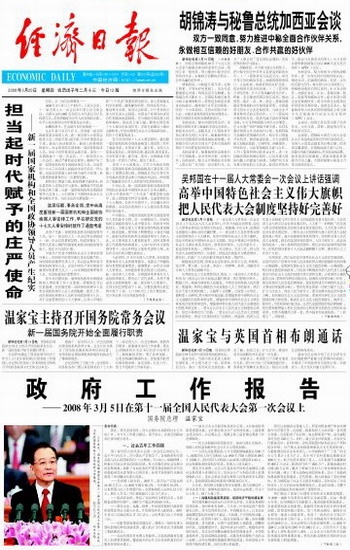 3月16日,十一届全国人大一次会议举行第六次全体会议,决定温家宝为国务院总理,决定了中央军事委员会副主席、委员,选举产生了最高人民法院院长、最高人民检察院检察长。