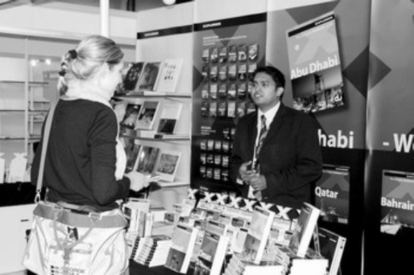 第十八届阿布扎比国际图书展日前在阿联酋首都阿布扎比国际会展中心开幕。本届书展集中展示了国际图书发行业界的最新出版成果与排版印刷科技。与往届不同的是,本届书展新增学术教育、幼儿读物等多个主题展馆,有助于各参展出版商明确自身市场定位、锁定潜在贸易对象。图为一家阿联酋出版公司策划推出的系列国际商务旅行指南图书吸引了参观者前来咨询选购。 本报驻