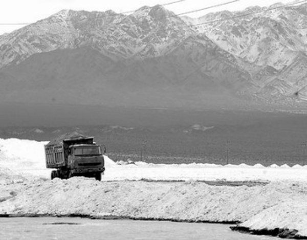 一辆运硝车在行驶途中(3月19日摄)。 位于天山脚下的新疆盐湖芒硝储藏量十分丰富,新疆盐湖制盐有限责任公司拥有的两条采硝船每天在此打捞芒硝4000吨以上,年产量在7080万吨左右。作为新疆境内最大的制硝基地,公司根据市场的需要进行生产加工芒硝,其产品主要运往内地及出口日本等国作为洗衣粉和染料的原料,受到市场欢迎。 新华社记者 赵 戈摄