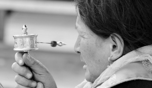图二 3月19日,一名藏族老阿妈在拉萨宇拓路口面对大昭寺祈愿。 新华社记者 格桑达瓦摄