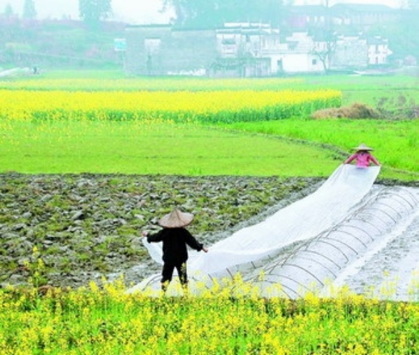 3月21日,江西婺源农民冒雨在田间加盖薄膜育种。当日,江西婺源下起小雨,乡村农民抓住农时,冒雨春耕播种。 洪德平摄(新华社发)